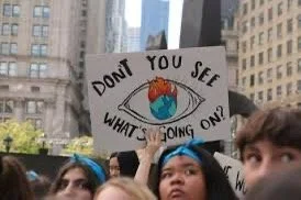 Their placard depicts a burning Earth, centered in an eye