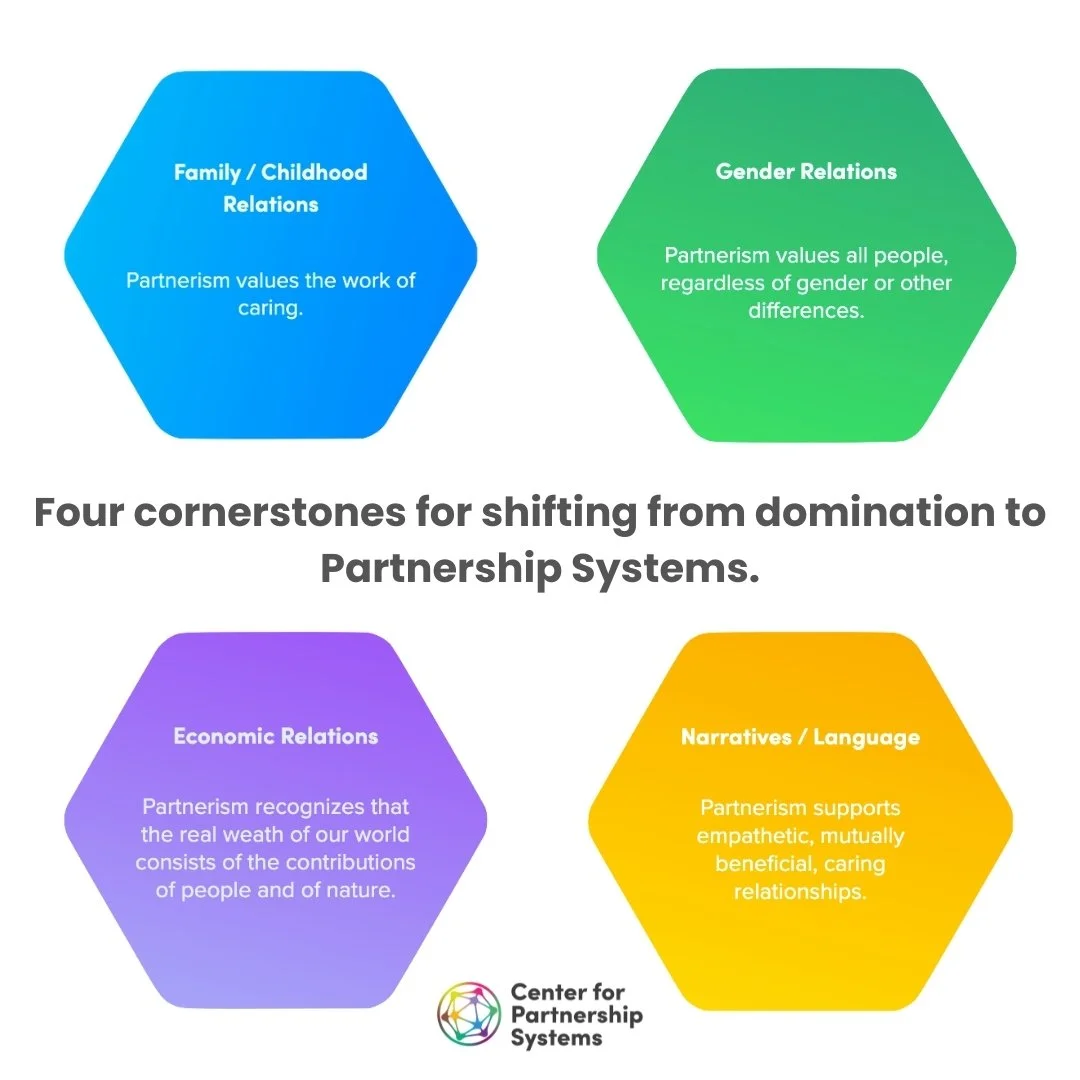 Eisler’s work reveals four essential and interconnected cornerstones for shifting away from the legacy of Domination that we’ve inherited and again building the Partnership Systems needed to support human thriving and the survival of our planet: