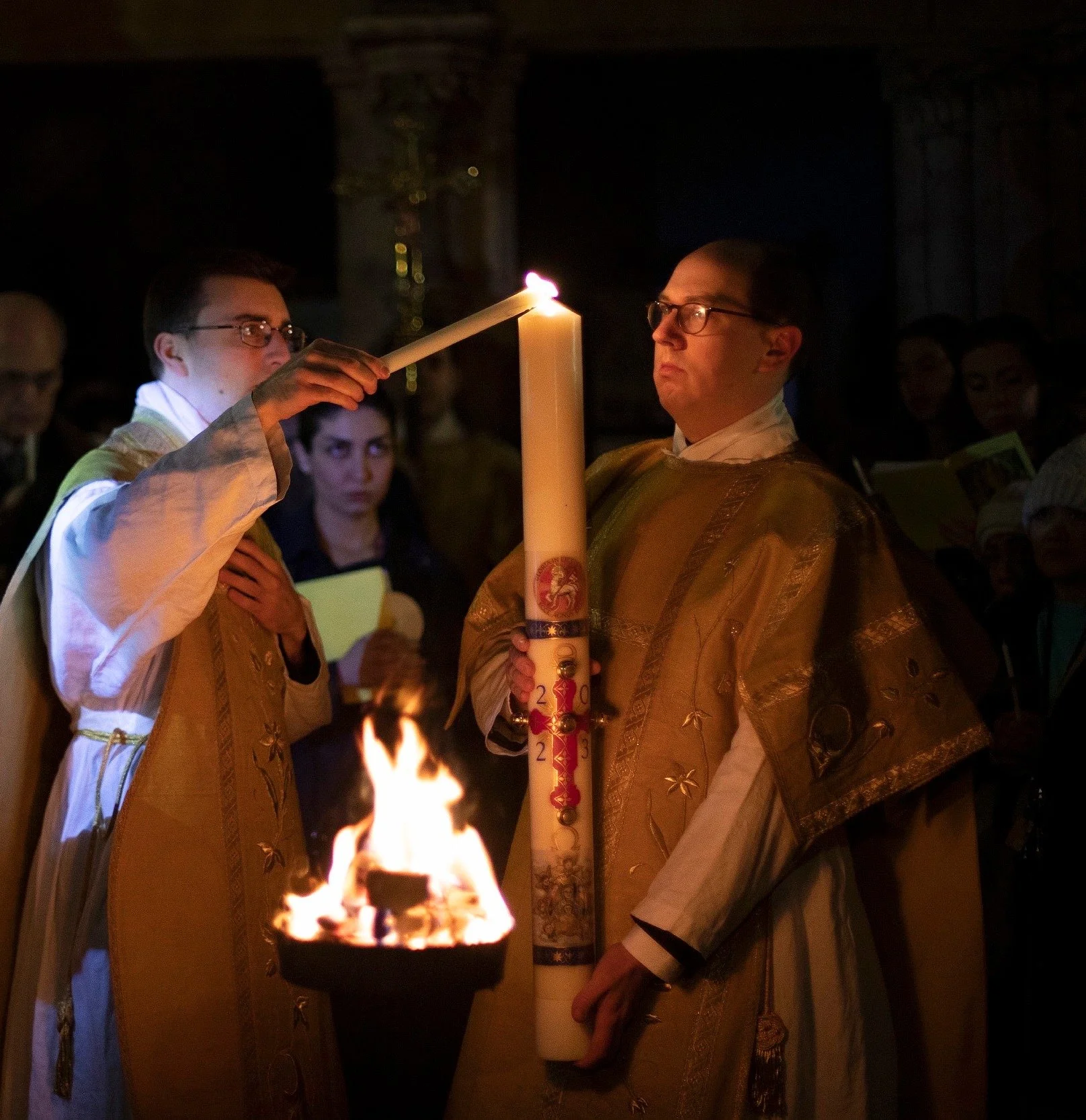 A large fire (symbolizing the Divine) is lit and from it is lighted a large candle, which symbolizes Christ and is called the Paschal candle.