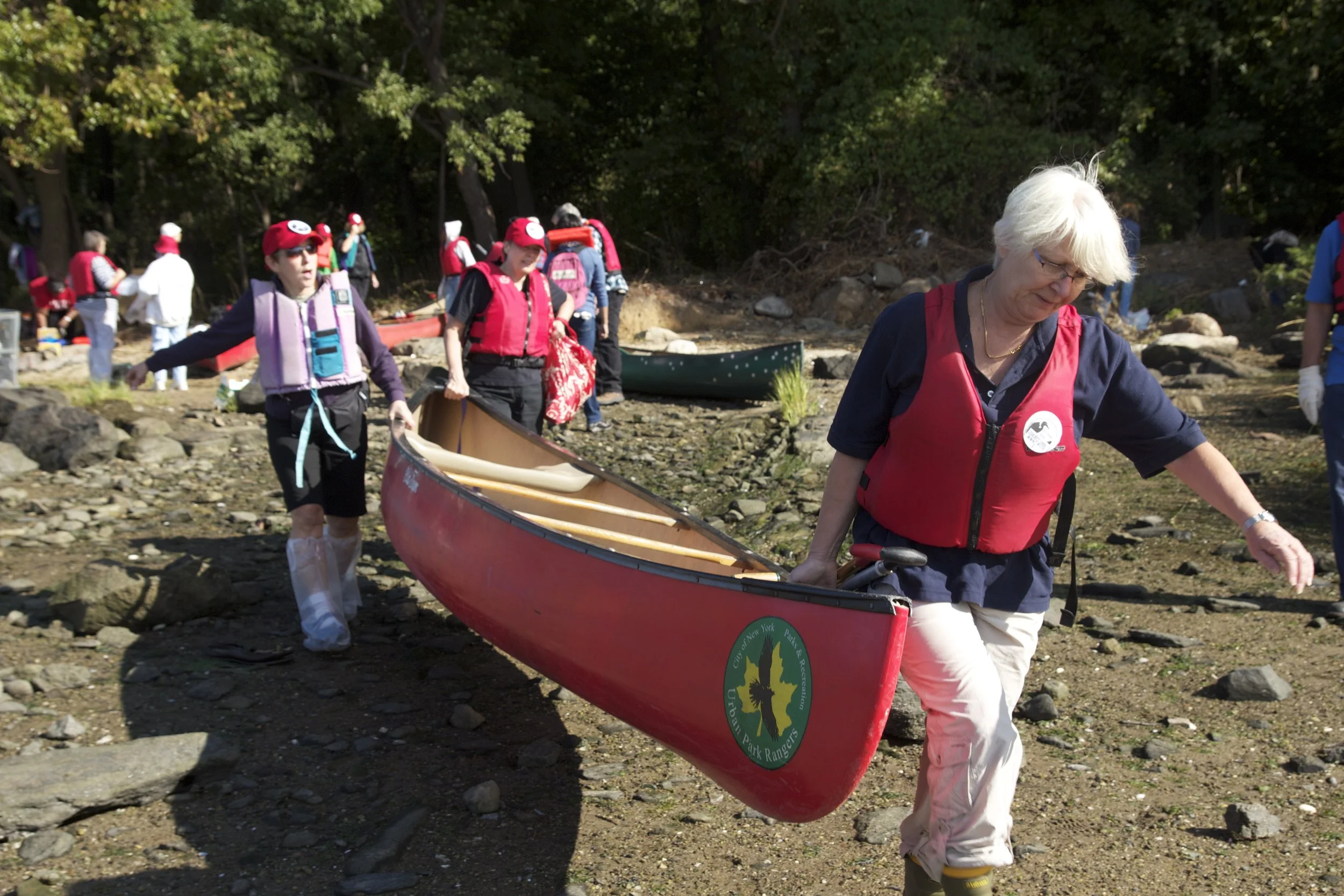 Dressed in rubber boots and red life jackets, Rae and 34 other volunteers paddled up river in red canoes that were supplied by [the Urban Park Rangers].
