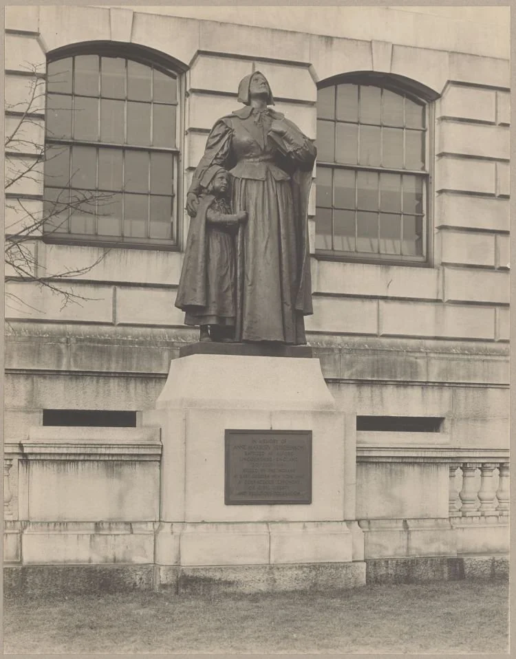 In front of the State House in Boston, Massachusetts, stands a statue of Anne Hutchinson with her daughter Susanna as a child by Cyrus Dallin.