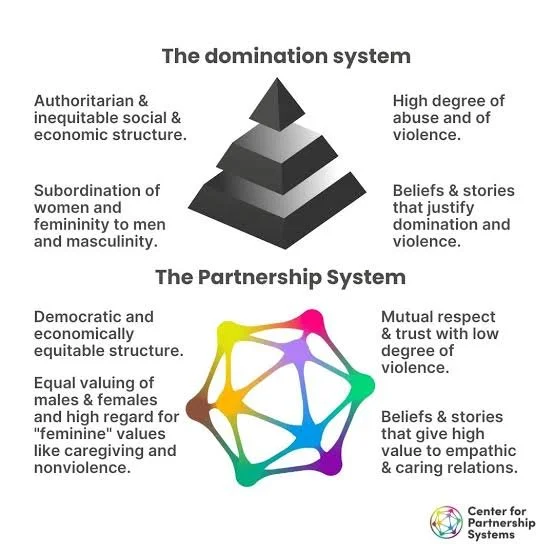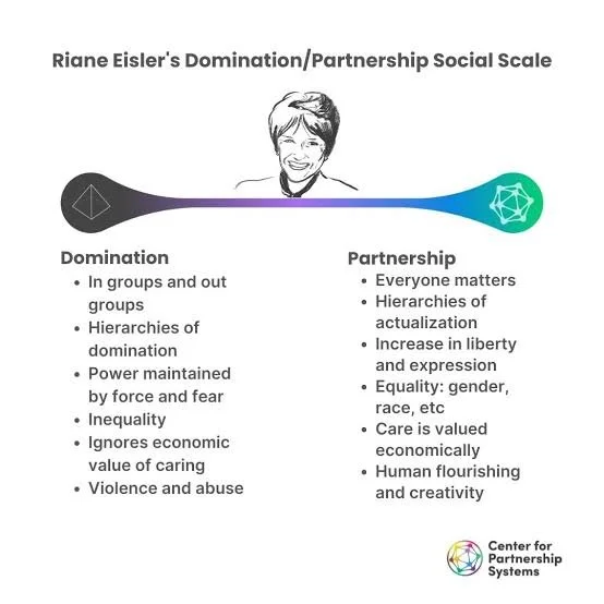2. She introduces a new way of characterizing how we humans exist—and, more importantly, have existed—in our relationships, in our societies, in our wholistic civilizations. She does so with two words: Dominator and Partnership.
