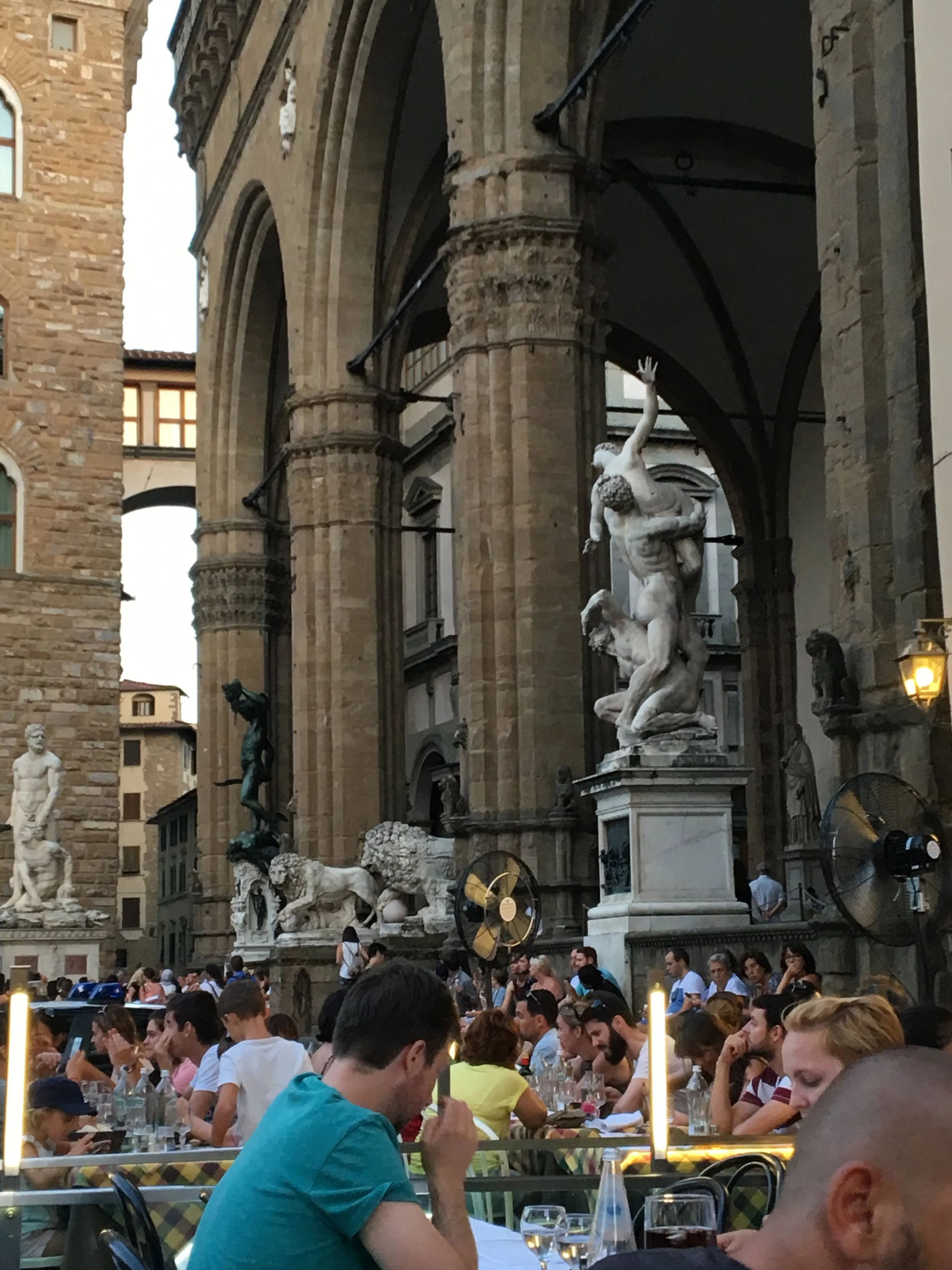 I specifically wanted to capture its location—a public square—and the proximity of the people (tourists?) who were enjoying an aperitif with friends, seemingly unperturbed by the image above them.